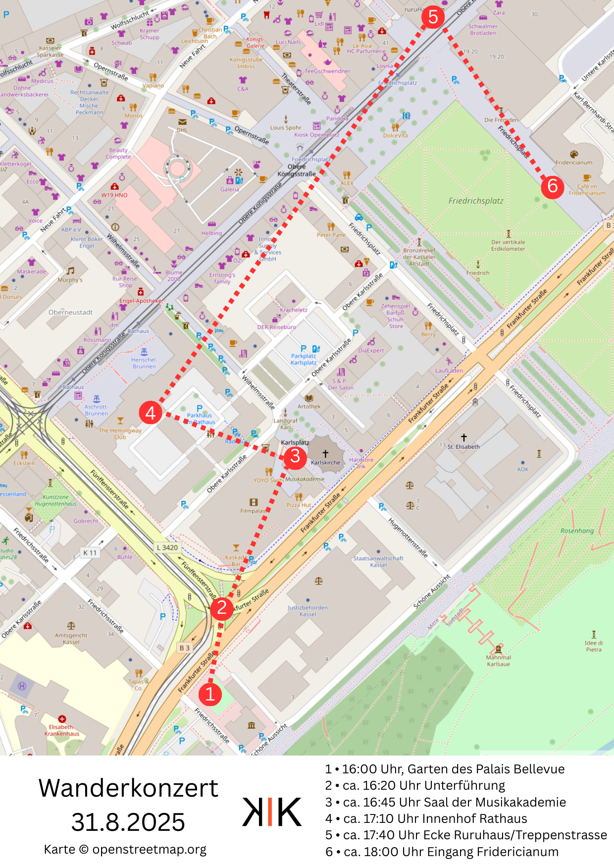 Zu einem neuen Konzert lädt die Komponisteninitiative Kassel (KIK) ein: Am Sonntag den 31.8. findet ein „Wanderkonzert“ statt. Wo wird gewandert? In der Stadt Kassel, die Route ist allerdings nicht lang und führt zu insgesamt 6 Stationen. An jeder dieser Stationen erklingt jeweils ein Werk eines der Komponisten der KIK (in der Reihenfolge Martin Forciniti, Diego Jascalevich, Michael Töpel, Werner Kirschbaum, Jens Josef, Ulli Götte). Die Künstlerin und Schauspielerin Lili Ullrich wird als Ciceronin das Publikum zu den einzelnen Orten führen und Informationen zu den Werken und ihren Interpreten geben.